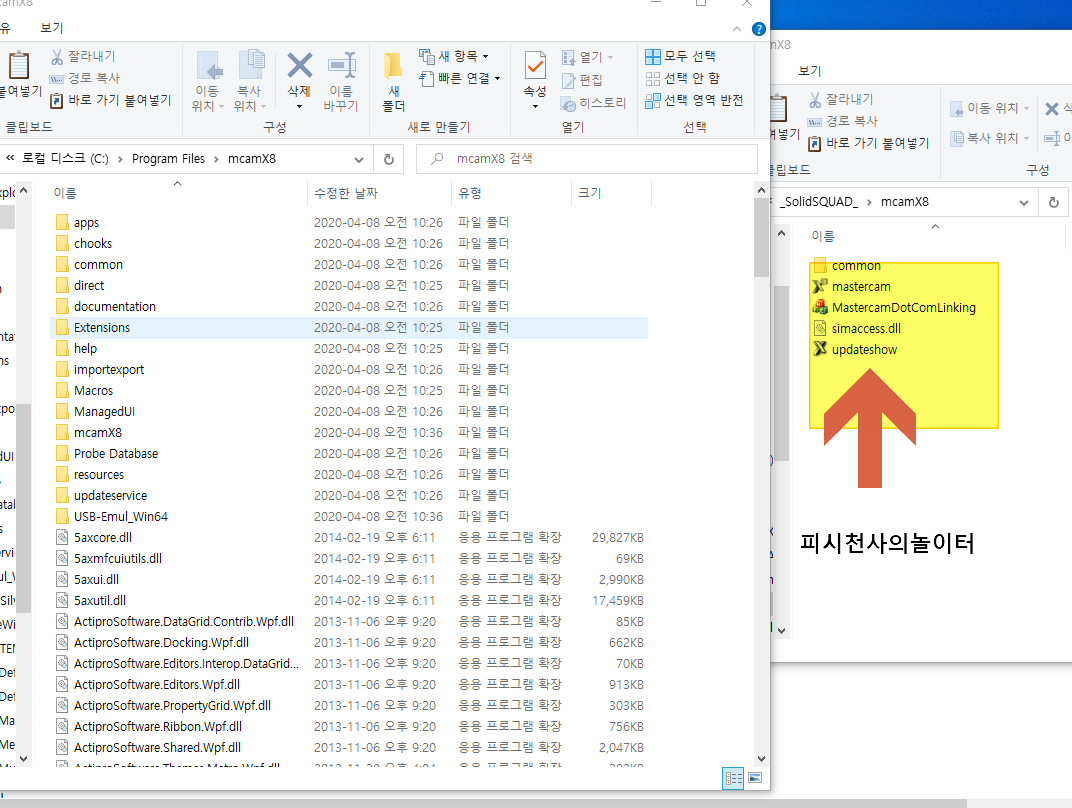 사진의 오른쪽이 마캠X8 크랙 폴더.왼쪽이 마캠X8 설치 폴더입니다.