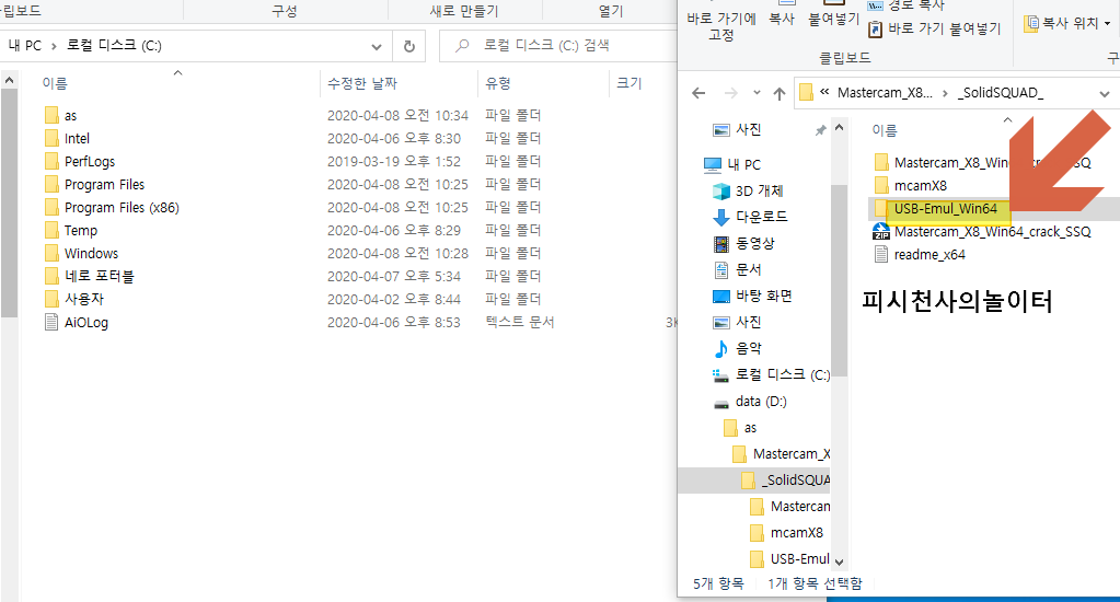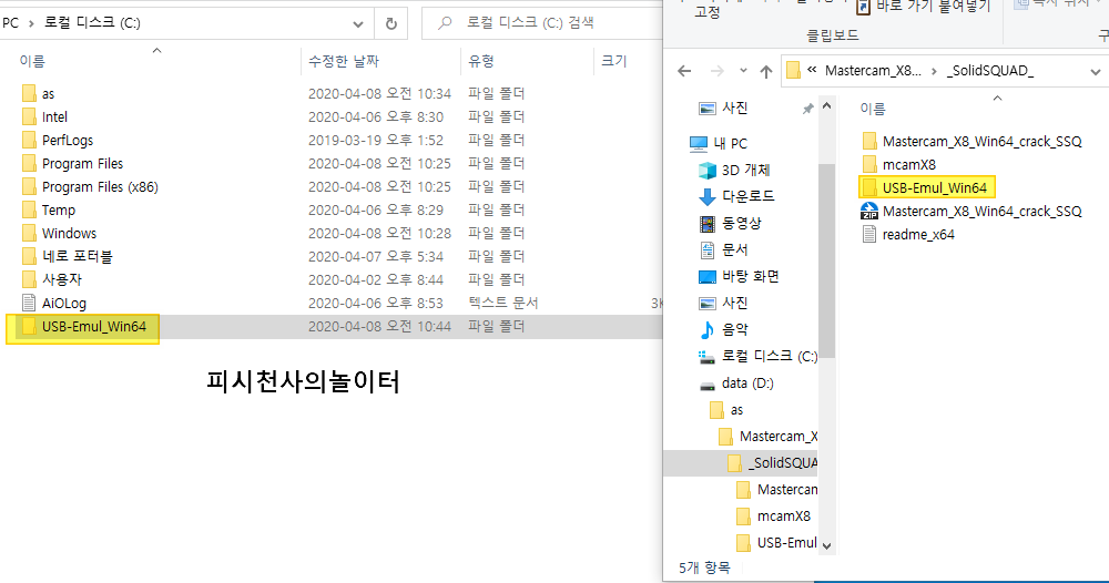 사진의 오른쪽이 마캠X8 크랙 폴더.왼쪽이 윈도우 루트폴더입니다.